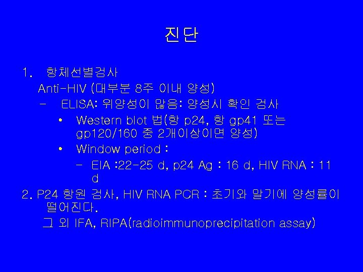 Western Blot HIV-1 Western Blot • • • Lane 1: Positive Control Lane 2: Negative Control Sample A: Negative Sample B: Indeterminate Sample C: Positive • 항 p 24, 항 gp 41 또는 gp 120/160 중 2개 이 상이면 양성