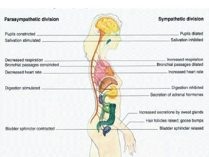 -Autonomic Nervous System. Nerves that connect to the heart, blood vessels, smooth muscles and glands Sympathetic Division Mobilizes the body’s resources for emergencies (e. g. , stimulate adrenal gland) Fight Parasympathetic Division or Generally conserves bodily resources Flight (e. g. , slows heart rate) Response Cannon (1932)