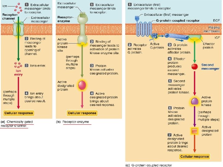 Chemical Messengers • Cell responses brought about primarily by signal transduction – Incoming signals conveyed to target cell’s interior • Binding of extracellular messenger (first messenger) to receptor brings about intracellular response by either – Opening or closing channels • Chemically gated receptor channel – Activating second-messenger systems • Activated by first messenger – Receptor-enzyme • Relays message to intracellular proteins that carry out dictated response – G-protein coupled receptor