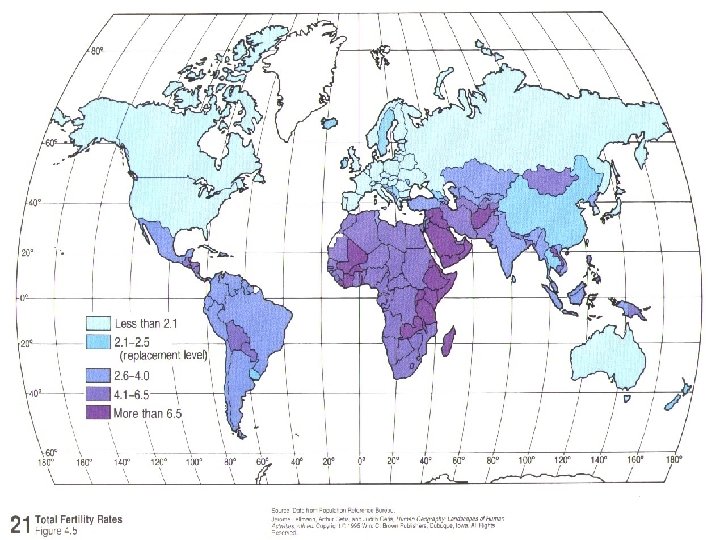 Human Population Dynamics • Total fertility rate (TFR) – – The average number of children born to a woman Average in developed countries = 1. 5 Average in developing countries = 3. 8 Worldwide 1990: 3. 1 now: 2. 76 • Replacement fertility rate (RFR) – The number of children a couple must have to replace themselves – A TFR of 2. 1 for developed countries with low infant and child mortality rates – Africa RFR = 2. 5