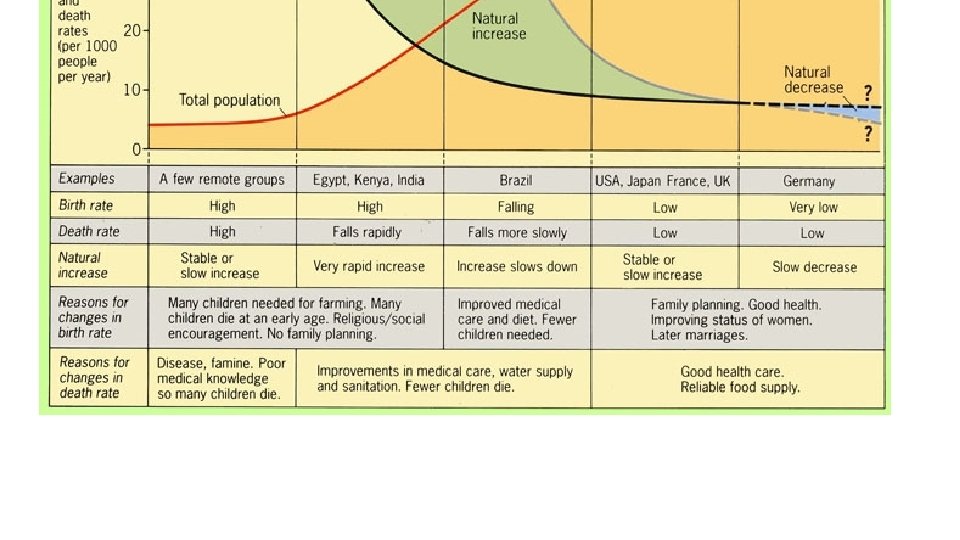 Demographic Transition Model Stage 1: High Fluctuating. Birth and Death Rate are BOTH very HIGH Stage 2: Early Expanding. Birth rate remains high Death rate is falling. Population steadily Rises Stage 3: Late Expanding. Birth rate begins to fall Death rate continues to fall. Population is still Rising Stage 4: Low Stationary. Both Birth and Death rate are low. Population in now beginning to steady or plateau Stage 5: Low Declining: Birth rate falls below Death rate. Population begins to decrease