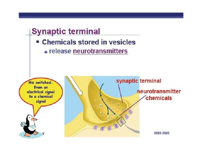 Anatomy of a Neuron • Cell body – main part • Dendrite – receives stimulus from other neurons • Axon – branches from cell body, sends the signal out • Myelin sheath – lipid layer for protection over neurons that allows for increase in speed of signal transmission • Synapse – gap between neurons; between the axon terminal of 1 neuron and the dendrite of a 2 nd neuron