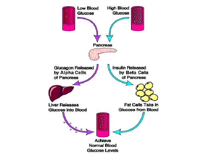 Feedback Mechanisms • Negative feedback – process in which a stimulus produces a response that opposes the original stimulus. • Ex. Blood sugar regulation – An increase in blood sugar level triggers the release of the hormone insulin by the pancreas – the hormone insulin lowers blood sugar level restoring the body to its original blood glucose level in two major ways: • it increases the ability of body cells to take in glucose from the blood • it converts blood glucose to the compound glycogen -- this compound is also called animal starch and is stored in our liver and muscles – A decrease in blood sugar levels triggers the release of the hormone glucagon by the pancreas • It causes the liver to release glucose into the blood to regulate blood sugar levels
