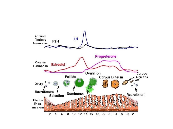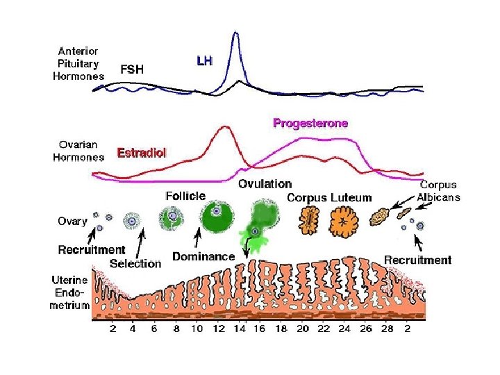 Overview • The menstrual cycle – The menstrual cycle is regulated by hormones of the hypothalamus, anterior pituitary, and ovaries – During the menstrual phase, in which the endometrium is shed, Gonadotropin Releasing Hormone (Gn. RH) is released from hypothalamus, which stimulates the anterior pituitary to release Follicle Stimulating Hormone (FSH) and Lutenizing Hormone (LH) – FSH stimulates the development of a few follicles in the ovary