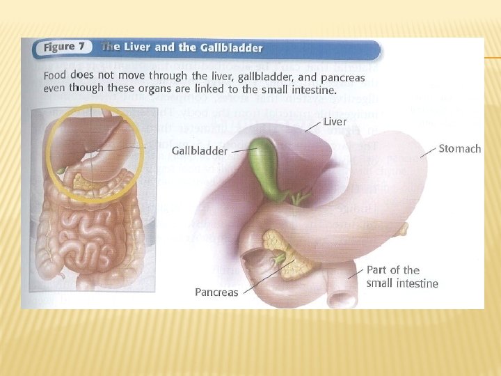 DIGESTIVE SYSTEM � Liver and gall bladder � Breaks down toxins, stores materials, produce bile � Bile is made by liver, stored in gall bladder, secreted in small intestine � Role in fat digestion