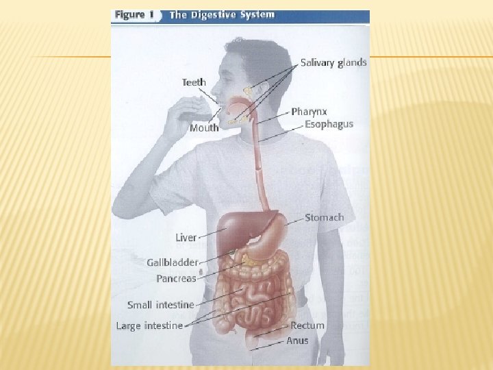 DIGESTIVE SYSTEM � Made up of tube like organs called digestive tract � Mouth, pharynx, esophagus, stomach, small and large intestines, rectum and anus � Salivary gland, liver, pancreas, and gall bladder also contribute but food does not pass through them