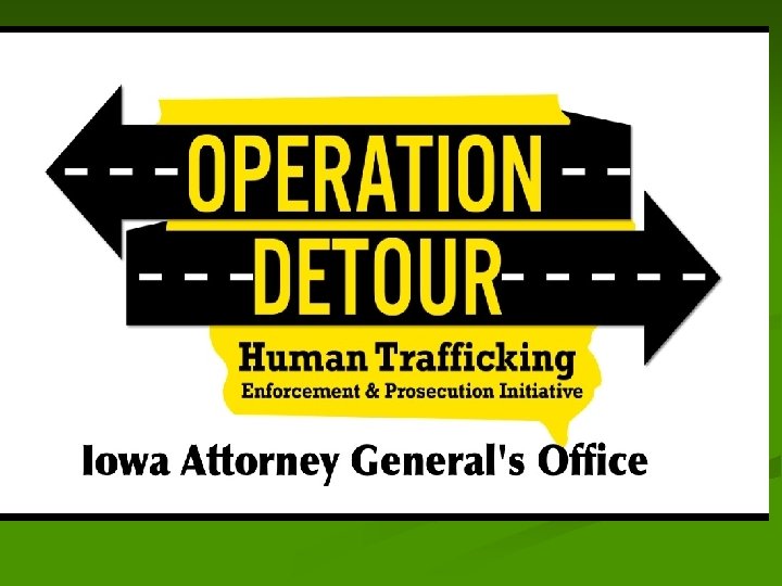 Does it really happen here? n n Iowa is centered between Minneapolis, Omaha, Kansas City and Chicago, all known human trafficking hubs Increasing seasonal, immigrant and refugee population Iowa’s largest metropolitan areas connected by network of interstate highways reaching all four US borders Rural areas create “safe havens” for traffickers to operate undetected. Experts have described Iowa as “the perfect hiding place” for trafficking; n Rural environment with multiple interstate vehicle, bus and rail ways crossing through Iowa allowing high volume routes to be used causing decreased potential for detection n Low per capita law enforcement presence in the state n Public perception: “It’s not here” so we’re not looking for it.
