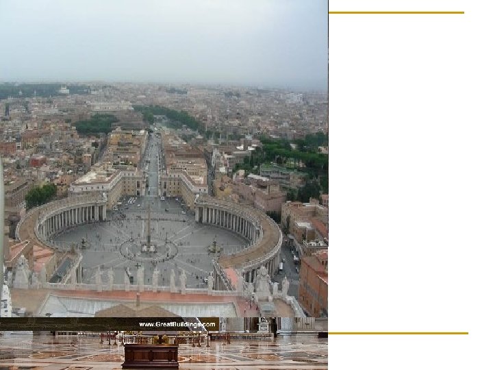 BRAMANT Basílica de Sant Pere del Vaticà n n El papa Juli II li va encarregar la basílica de Sant Pere del Vaticà. Va projectar una església de creu grega amb voltes de mig canó i una cúpula al centre de la creu. El monument més important del Cínquecento, i la construcció del qual i decoració va atraure nombrosos artistes. Bramant va ser l'arquitecte encarregat del projecte. En els anys posteriors a la seua mort, en 1514, les obres van progressar poc El treball es va reprendre més tard sota l'adreça de Miguel Ángel. La resta de l'església va ser obra de Maderno
