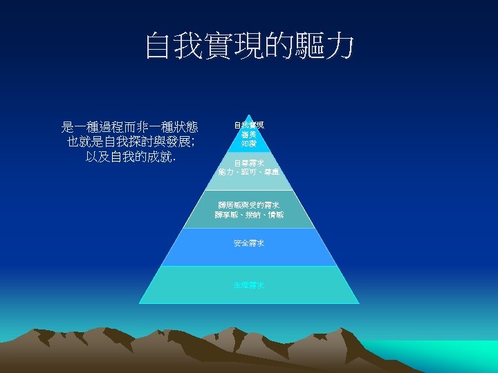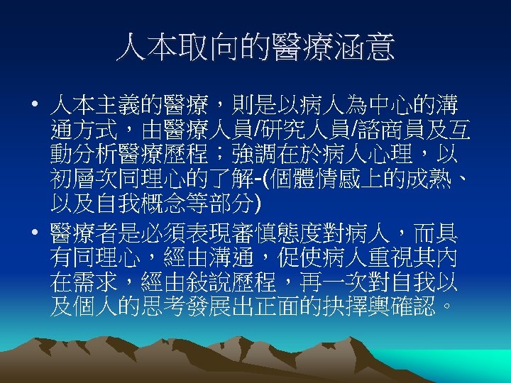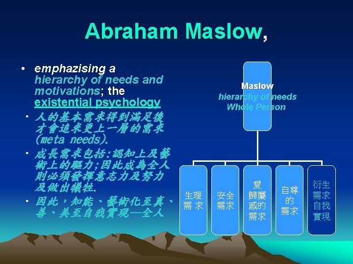 Humanistic psychology • includes several approaches to counseling and therapy. • Among the earliest approaches we find the developmental theory of Abraham Maslow, Maslow emphazising a hierarchy of needs and motivations; the existential psychology of Rollo May acknowledging human choice and the tragic aspects of human existence; and the person-centered or client-centered therapy of Carl Rogers, Rogers which is centered around the clients' capacity for selfdirection and understanding of his/her own development (Clay, 2002).