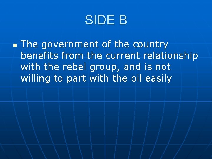 SIDE B n The government of the country benefits from the current relationship with the rebel group, and is not willing to part with the oil easily