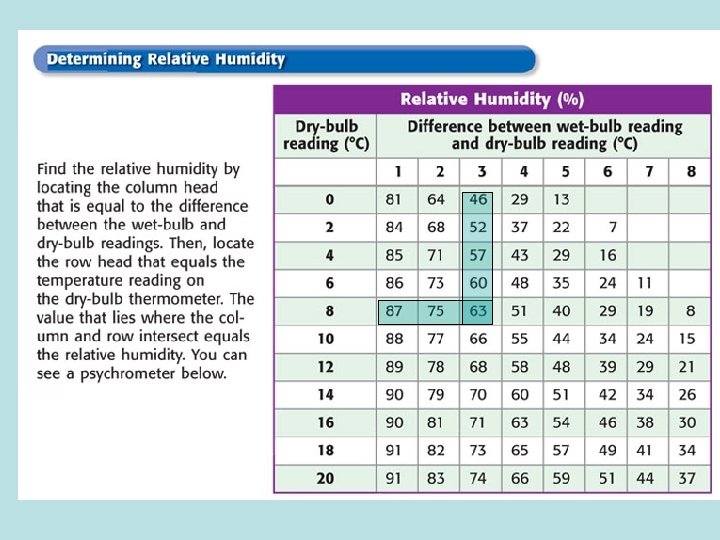 Ex. 1 Dry Bulb = 14 degrees C Wet Bulb = 10 degrees C Difference is 14 -10 = 4 1 st – look at dry bulb reading (14) 2 nd – find difference (4) 3 rd – RH is where they meet = 60%