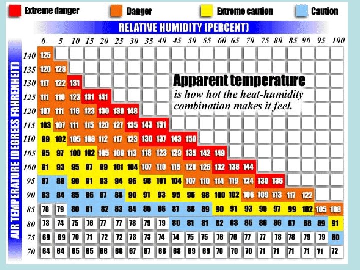 Relative Humidity • RELATIVE HUMIDITY is the amount of water in the air compared to the amount of water the air could possibly hold. • Humidity values are usually given as Relative Humidity %.