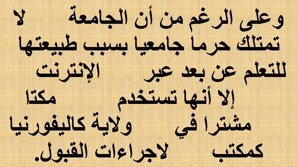 Although the university has no campus due to its online distance learning nature, it uses a shared office in California as an office of admission.