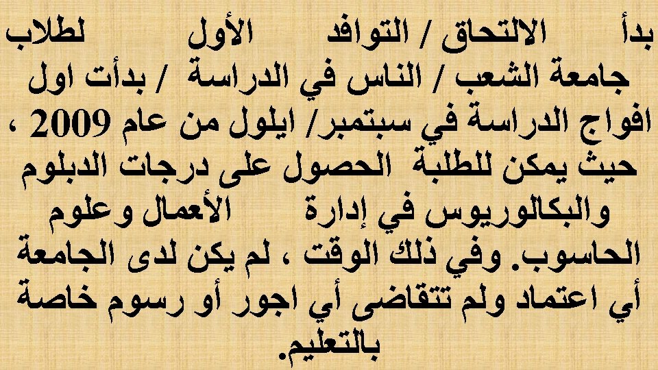 The first intake of Uo. People students began studying in September 2009, studying for associate and bachelor's degrees in business administration and computer science. At that time, the school had no accreditation and did not charge any fees or tuition.