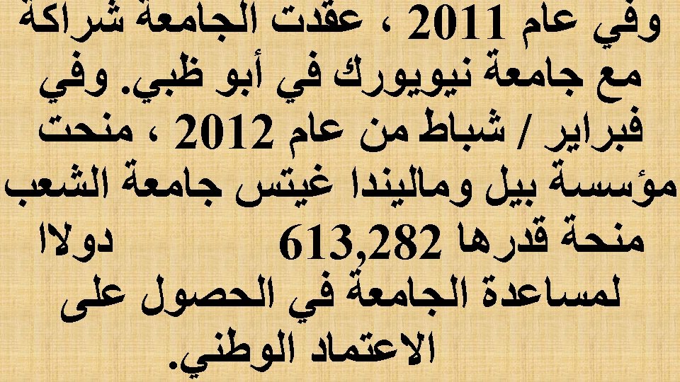 In 2011, the university formed a partnership with the New York University at Abu Dhabi. In February 2012, the Bill & Melinda Gates Foundation awarded the University of the People a grant of $613, 282 for the purposes of helping the university earn national accreditation.