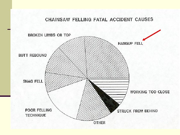 CHAINSAW FELLING FATAL ACCIDENT CAUSES n Hang-up fell: A little over 25% n Broken limbs or top: About 12% n Agency trends: n The majority of near miss reports we receive concern hang-ups and are related to the top coming out or the snag not falling where they thought it would. n We have had serious injuries because the top came out while removing hang-ups.