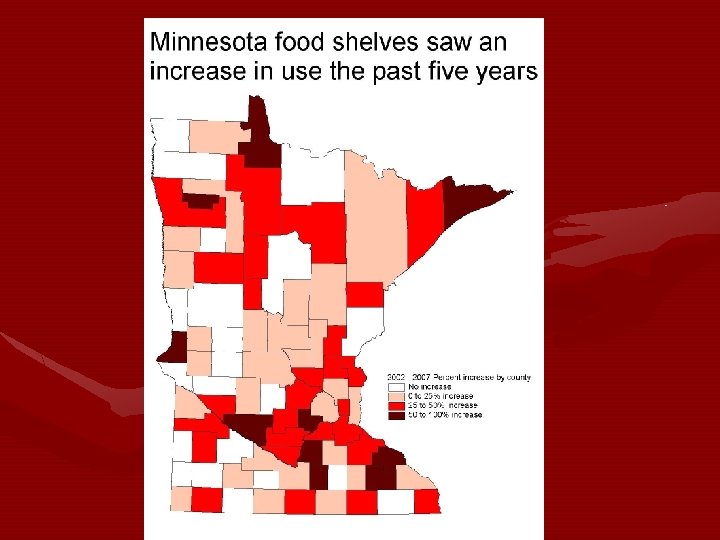 Hunger in Minnesota • Is a chronic problem • 8. 2 % of Minnesota households are hungry every day. • Food shelf visits increased 50% over the last 6 years • 1. 8 million visits in 2006 • Hunger costs Minnesota $1. 1 billion every year.