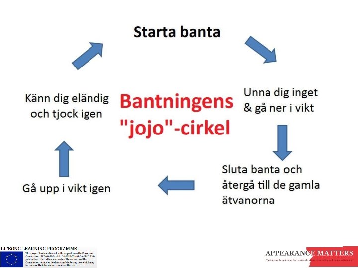 • Ohälsosamma ätmönster inkluderar “snabbdieter” och att ta ohälsosamma kosttillskott och bantningspiller. • Förutom att det är ohälsosamt, är den eventuella viktminskningen ofta kortvarig – och ineffektiv bantning och låg självkänsla kan leda till viktökning.