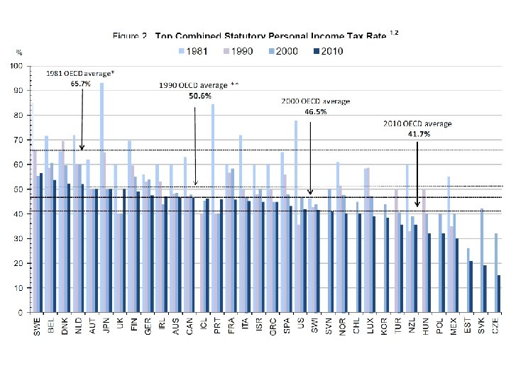 Internationell konkurrens om högutbildade • • Sådana överväganden spelade liten roll 1991 Globaliseringen innebär specialisering på kunskapsintensiv produktion för ett land som Sverige Då viktigt kunna konkurrera om den mest kvalificerade arbetskraften Migration styrs av skillnader i förväntad nytta - beror bl a på skillnader i förväntad inkomst efter skatt Självklart att höga skatter för höginkomsttagare då är en negativ faktor för attrahera kvalificerad arbetskraft Men högre offentlig konsumtion/mer generösa socialförsäkringar är en positiv faktor - mindre viktigt för höginkomst- än låginkomsttagare Sverige har inte följt med i internationell trend mot lägre högsta marginalskatter