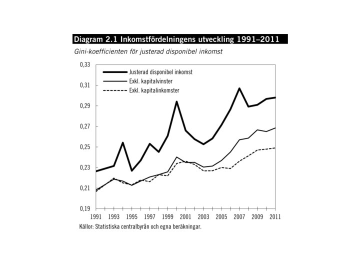Fördelningsargument • Sverige har en internationellt sett mycket jämn inkomstfördelning • Men inkomstskillnaderna har ökat sedan början av 1980 -talet • Ojämnare inkomstfördelning ökar värdet av omfördelning - avtagande marginalnytta