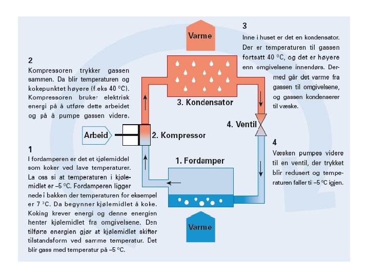 Varmepumper En varmepumpe overfører indre energi fra omgivelsene til en bolig slik at innetemperaturen i boligen stiger mens utetemperaturen faller (et omvendt kjøleskap). Fordi utetemperaturen er lavere enn innetemperaturen, må varmepumpa bruke høyverdig elektrisk energi.