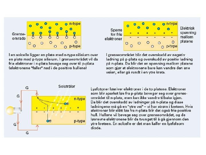 Solcelleanlegg I solceller blir solenergi omgjort direkte til elektrisk energi. I Norge bruker vi solceller mest i hytteområder som ligger langt fra eksisterende elektrisitetsnett. Solcellene er i dag så effektive at de også kan levere elektrisk energi til bolighus og kontorbygg.
