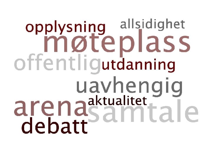 Råd – helt til slutt • Skill mellom rollen som utleier og arrangør • Vær modig – still de vanskelige spørsmålene • Tenk nye stemmer – også i valg av tema – hvem kommer lite til orde i samfunnsdebatten? • Hvem er den svake parten? • Har angrepne part kommet til orde? • Vær åpen og ærlig – tør å stå i stormen • Vær alltid tydelig om egen rolle • Ytringsfriheten er viktigst å forsvare når det stormer • Fordel med plakat – men det viktigste er prosess og bevissthet