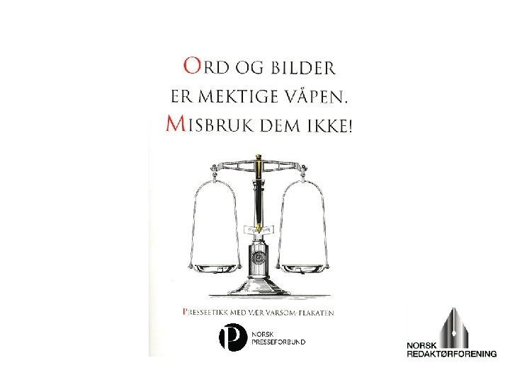 Redaktøransvaret – i redaktørplakaten • En redaktør skal alltid ha frie mediers ideelle mål for øye. • Redaktøren skal ivareta ytringsfriheten og etter beste evne arbeide for det som etter hans/hennes mening tjener samfunnet. • Gjennom sitt medium skal redaktøren fremme en saklig og fri informasjons- og opinionsformidling. • Redaktøren skal etterstrebe en journalistikk som gjør det klart for mottakeren hva som er reportasje og formidling av informasjoner og fakta, og hva som er mediets egne meninger og vurderinger.