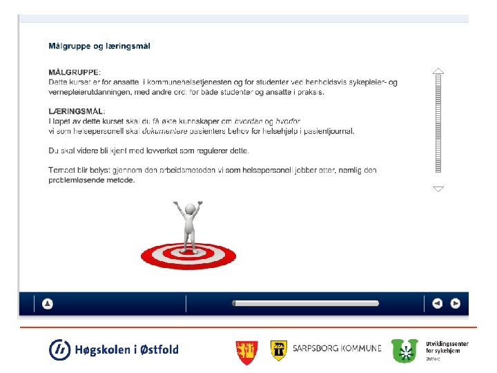 E-læring – dokumentasjon helsehjelp • Samarbeidsprosjekt Sarpsborg, Fredrikstad Høgskolen i Østfold – 2 årig • Januar 2014 - desember 2015 Målgruppe for kurset: • sykepleier og vernepleierstudenter • ansatte i kommunehelsetjenesten
