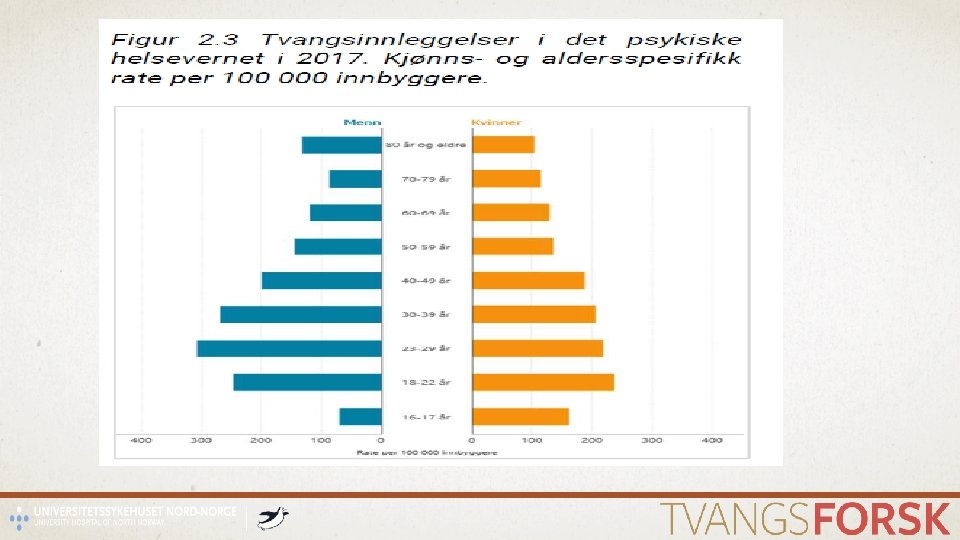 KJØNN • Internasjonalt • Menn høyere risiko for å bli tvangsinnlagt enn kvinner • Norge • Menn høyere risiko for å bli tvangsinnlagt enn kvinner • Menn har høyere rater av tvangsinnleggelser enn kvinner