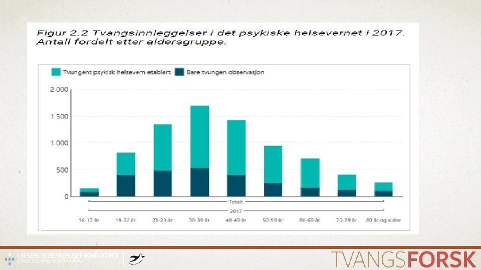 HVORDAN OPPLEVER DE Å VÆRE TVANGSINNLAGT? • Internasjonalt - Akther et al. 2019 – 56 studier fra 11 land (inkludert Norge) • Det varierer • noen opplevde verdsettelse og aksept • mer vanlig med opplevelser som sinne, forvirring, frykt, harme, at det var plagsomt, og forsvarsreaksjoner. • også vanlig å oppleve redusert egenverd og selvrespekt • noen pasienter mente at deres tvangsinnleggelse hadde vært nødvendig beskrev mange pasienter en opplevelse av maktesløshet og dehumanisering. • Når politiet var involvert beskrives opplevelser av skam og av å bli kriminalisert, særlig relatert til å bli ilagt håndjern og i politibil. - opptatt av hvordan naboene ville oppfatte det. • Tvangsbruken innvirket også på opplevelsen av egenverd i etterkant av tvangsinnleggelsen. • De følte at de ville bli utsatt for framtidig stigma og fordommer både i de psykiske helsetjenestene og i samfunnet for øvrig. Dermed forlenget tvangsinnleggelsen erfaringen av å være marginalisert - som mange allerede erfarte grunnet deres psykiske lidelse. • Norge • Sprikende funn