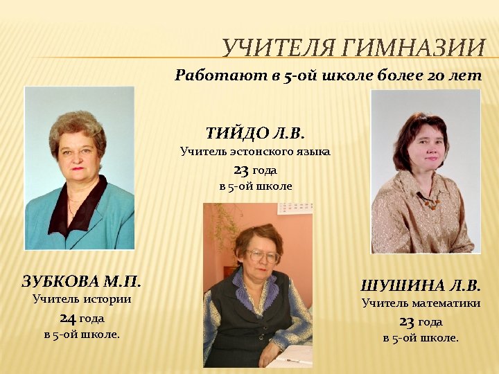 МЕДАЛИСТЫ Выпускники 5 -ой школы с золотой медалью 1985 – Valeri Liverov 1986 – Jelena Makarõtševa 1987 – Jelena Nikonova, Irina Bazina 1988 – Jelena Baikova 1989 – Anžela Dobõtšina 1990 – Larissa Netrobtšuk 1991 – Liina Võssotskaja 1993 – Olga Volkotrub, Galina Bortsšanenko 1999 – Olga Lunkova, Kristina Pirgop 2001 – Sergei Nikitin 2002 – Anna Bogatõrjeva, Anna Bõkova, Vadim Ivanov 2006 – Julia Sorokina, Irina Kuzina 2008 – Oksana Neškova
