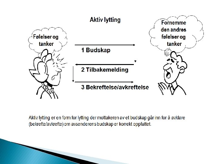 Ø God kommunikasjon henger sammen med evnen til å lytte. Ø Hører vi egentlig budskapet? Ø Ø Ø Når vi bruker tid på å lytte bruker vi samtidig tid på å forstå hva den andre kommuniserer. Forståelse for hva den andre kommuniserer vil gi muligheten til et godt svar, og kommunikasjon vil automatisk bli bedre. Toneleie og kroppsspråk er viktige kommunikasjonsfaktorer vi sender ut. Ø Tenker vi ofte nok på det? .