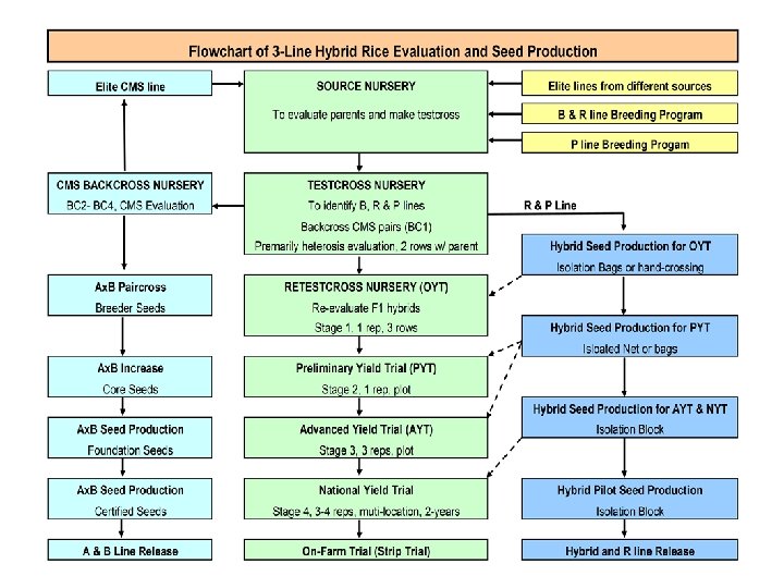Requirements for 3 Lines in CMS System Ø A-line ü Stable Sterility ü Well developed floral traits for outcrossing ü Easily, wide-spectum, & strongly to be restored Ø B-line ü Well developed floral traits with large pollen load ü Good combining ability Ø R-line ü Strong restore ability ü Good combining ability ü Taller than A-line ü Large pollen load, normal flowering traits and timing