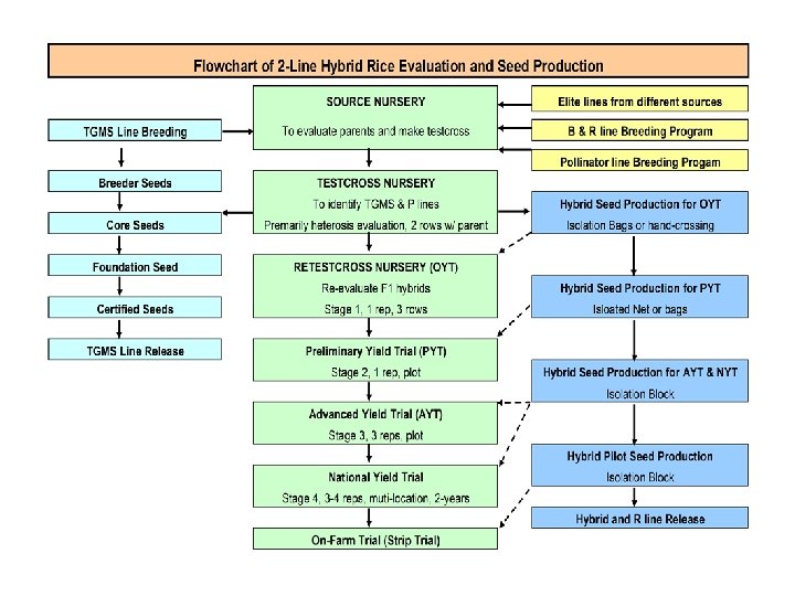 Advantage & Disadvantage of 2 -line hybrid rice system Ø Advantages ü Simplified procedure of hybrid seed production ü Multiple and diverse germplasm available as parents ü Any line could be bred as female ü 97% (2 -line) vs 5% (3 -line) of germplasm as male ü Increased chance of developing desirable & heterotic hybrids ü Multiple cytoplasm courses as female parents Ø Disadvantages ü Environmental effect on sterility could cause seed purity problem