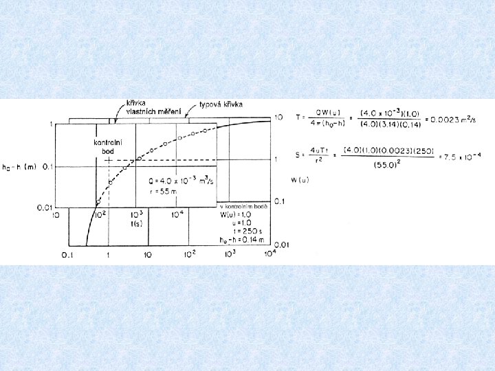 Základní postup stanovení hydraulických parametrů Theisovou metodou (bilogaritmická metoda) • v logaritmické měřítku se vynese W(u) proti 1/u – typová křivka • vynese se křivka z čerpací zkoušky ve stejném měřítku jako křivka s proti t/r 2, nebo t, nebo 1/r 2 • zkonstruovaná křivka se přiloží na typovou křivku tak, aby osy byly rovnoběžné • obě křivky se musí co nejvíce překrývat • konstanty na pravých stranách rovnic představují konstantní rozdíl, vyjádřený graficky posunutím křivky čerpací zkoušky oproti typové křivce • velikost posunutí je definovaná parametry T a S (viz rovnice) • velikosti posunutí souřadnic určíme proložením typové křivky křivkou čerpací zkoušky • po odečtení souřadnic libovolně zvoleného vztažného bodu W(u) a 1/u z typové křivky můžeme dosazením do rovnic určit parametry T a S