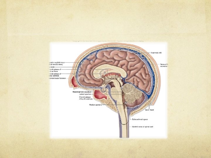 • • Sidoventriklar Tredje ventrikeln Fjärde ventrikeln Akvedukten • Plexus choroideus • Arachnoida villi/Paccionis granulationer