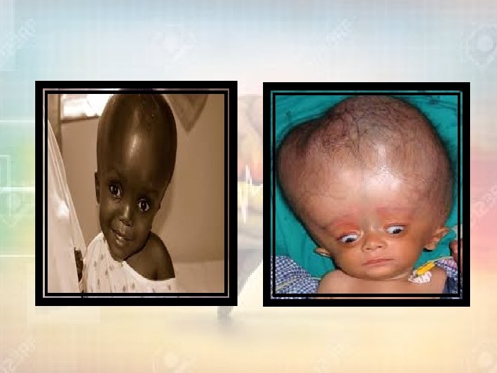 Presenting features Hydrocephalus in infants • failure to thrive. • increased skull circumference (compared with normal growth curves). • tense anterior fontanelle. • ‘cracked pot’ sound on skull percussion. ( hyper-resonance) • transillumination of cranial cavity with strong light. • severe, impaired conscious level and Vomiting. • ‘setting sun’ appearance due to lid retraction and impaired upward gaze from 3 rd ventricular pressure on the midbrain tectum. • thin scalp with dilated veins.