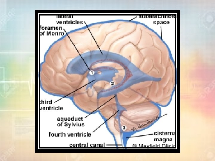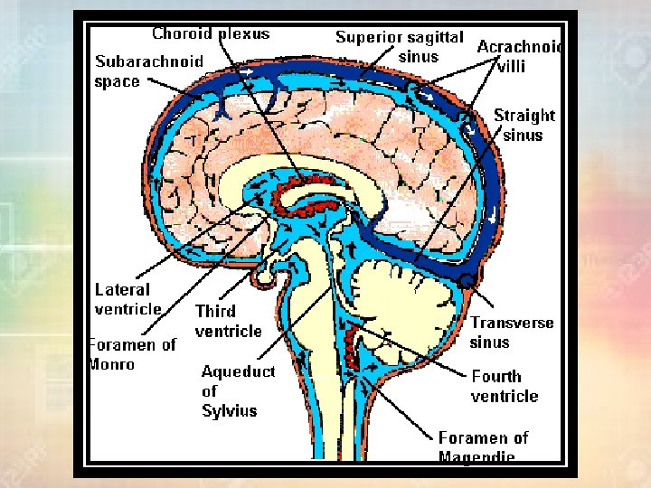 CSF circulation • The CSF flows from the lateral ventricles through the foramen of Monro into the 3 rd ventricle, via the aqueduct of Sylvius into the 4 th ventricle and then through the foramina of Magendie and Luschka into the subarachnoid space and basal cisterns. • The CSF circulates throughout the spinal subarachnoid space and the basal cisterns up through the tentorial hiatus. It flows over the cerebral hemispheres and is largely absorbed by the arachnoid villi of the dural sinuses.