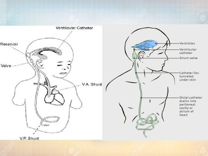Ventriculoperitoneal shunt • involves the insertion of a catheter into the lateral ventricle. The catheter is then connected to a shunt valve under the scalp and finally to a distal catheter, which is tunneled subcutaneously down to the abdomen and inserted into the peritoneal cavity. • If the CSF pressure exceeds the shunt valve pressure, then CSF will flow out of the distal catheter and be absorbed by the peritoneal lining.