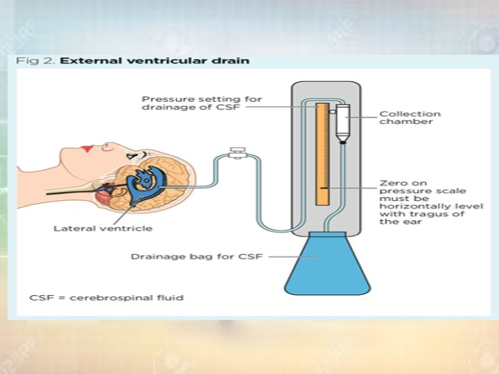 External drains • External drains can be placed within the ventricle (EVD) or the lumbar thecal sac (lumbar drain). • These are useful for temporary CSF drainage and can be used to administer intrathecal antibiotics to treat CSF infection. , take sample and decrease ICP