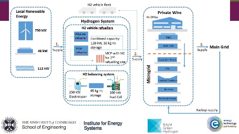 Levenmouth Community Energy Project (LCEP) Demonstration project to show hydrogen’s different uses 910 k. W renewable generation 8 building parallel microgrid Toshiba H 2 EMS Smart Grid control 250 k. W electrolyser/100 k. W fuel cell ESS 45 kg hydrogen storage tanks ≈ 1400 k. Wh 2 x 10 kg per day hydrogen refuellers 17 vehicle fleet