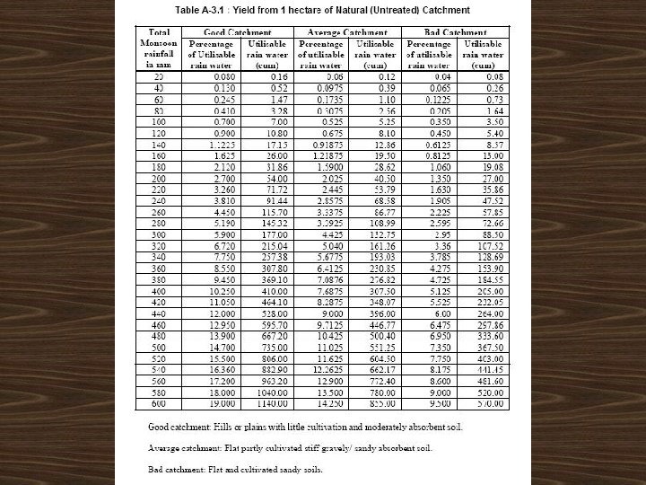 DESIGN OF PERCOLATION TANK Capacity of the percolation tank has to be calculated on the basis of the rainfall and catchment area of the tank. Also the weir length (surplus weir) has to be calculated. The procedure is as follows: 1. Select the site for the percolation tank. 2. From the toposheet, find out the correct catchment area of the watershed at that location. 3. Compute catchment yield from rainfall and runoff coefficient or Strange's table (using monsoon rainfall; nature of catchment - good, average or bad; and catchment area).