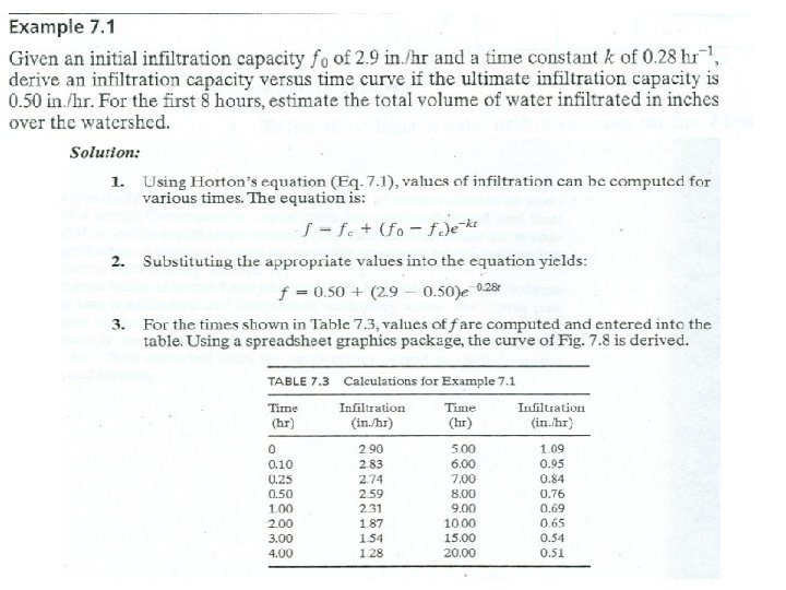 Horton's Model (1940) • Considering exponential behavior of infiltration • Following equation developed for finding rate curve of infiltration capacity f(t) at any time t f(t) = fc + (f 0 + fc)e-kt • f 0 = infiltration rate just at the beginning of rainfall (mm/hr) • fc = steady state infiltration capacity (mm/hr) • k = Horton’s infiltration constant dependent on vegetal cover and type of soil (hr-1)