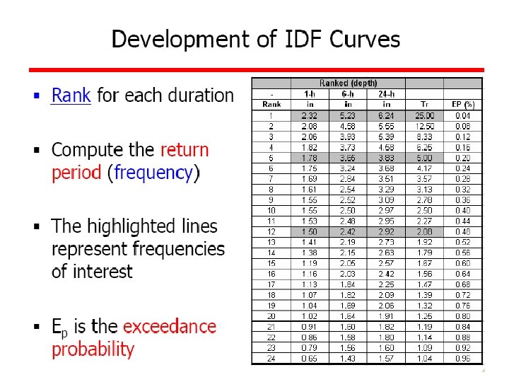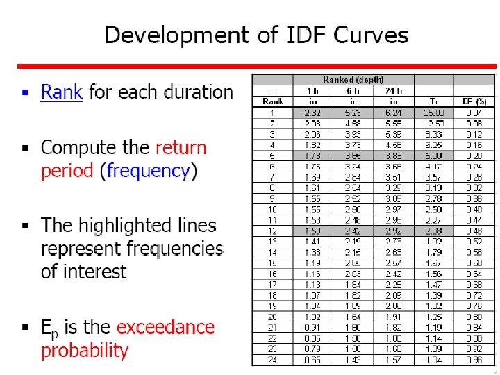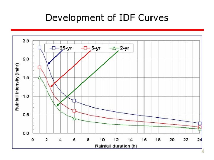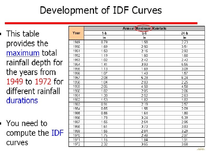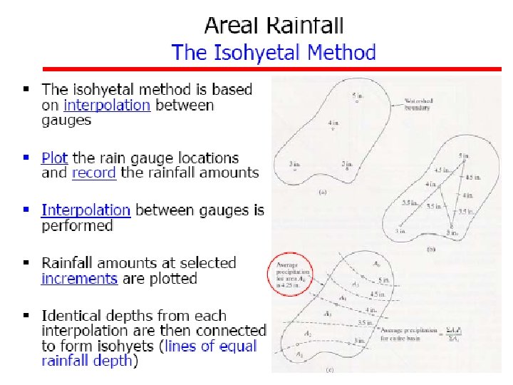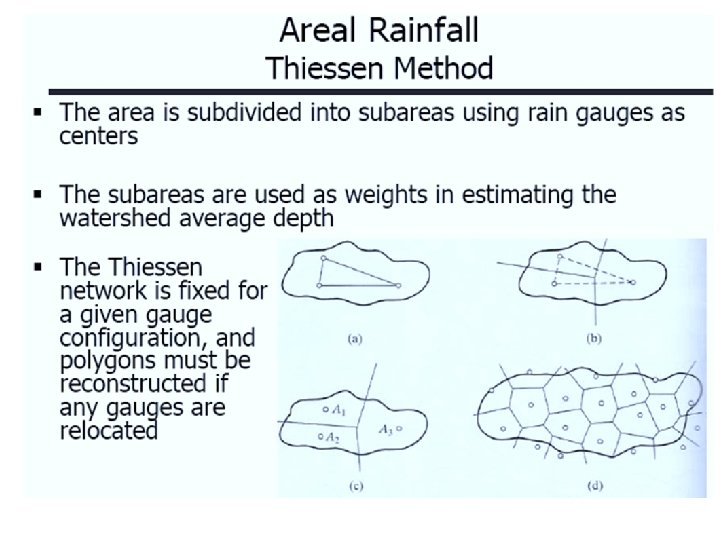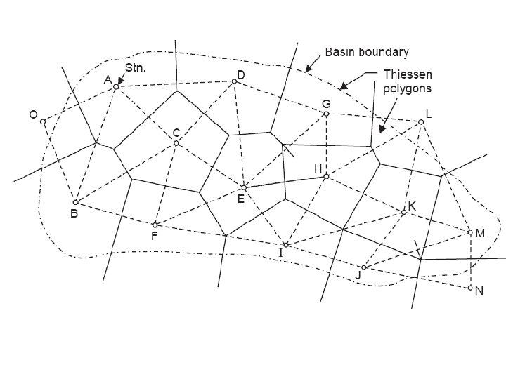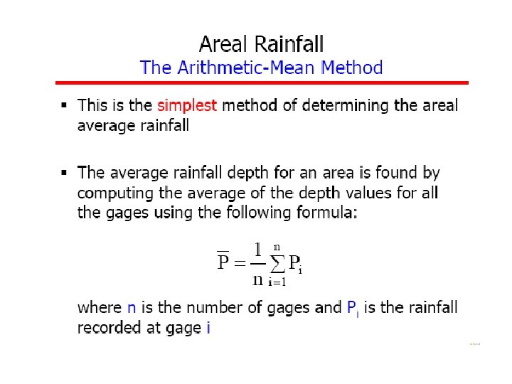 Methods of Computing a Rainfall • Arithmetic average • Theissen polygons • Isohyetal method Although, most of these calculations are done with computer mapping programs, it is still useful to understand these methods.