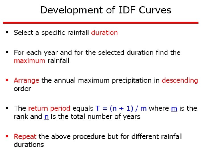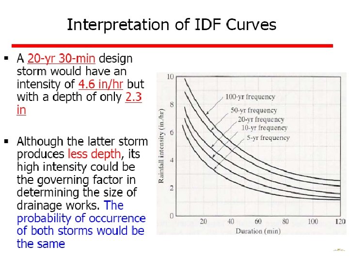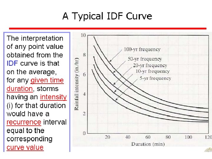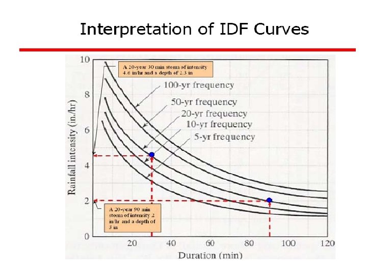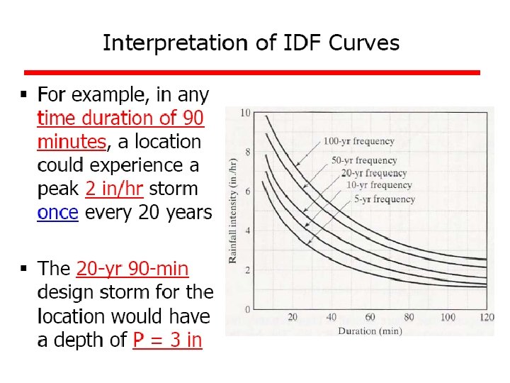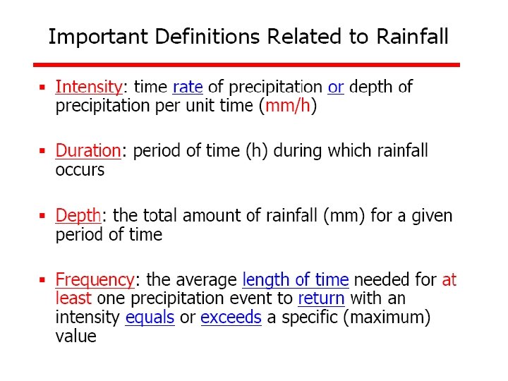 Ex 4: A small catchment of area 150 ha received a rainfall of 10. 5 cm in 90 minutes due to a storm. At the of the catchment, the stream draining the catchment was dry before the storm and experienced a runoff lasting for 10 hours with an average discharge of 1. 5 m 3/s. The stream was again dry after the runoff event. (a) what is the amount of water which was not available to runoff due to combined effect of infiltration, evaporation and transpiration? (b) What is the ratio of runoff to precipitation?