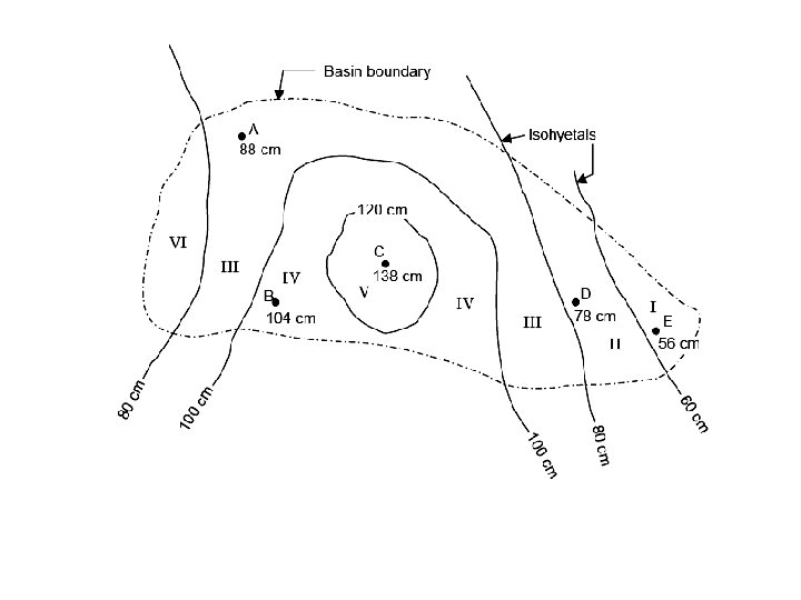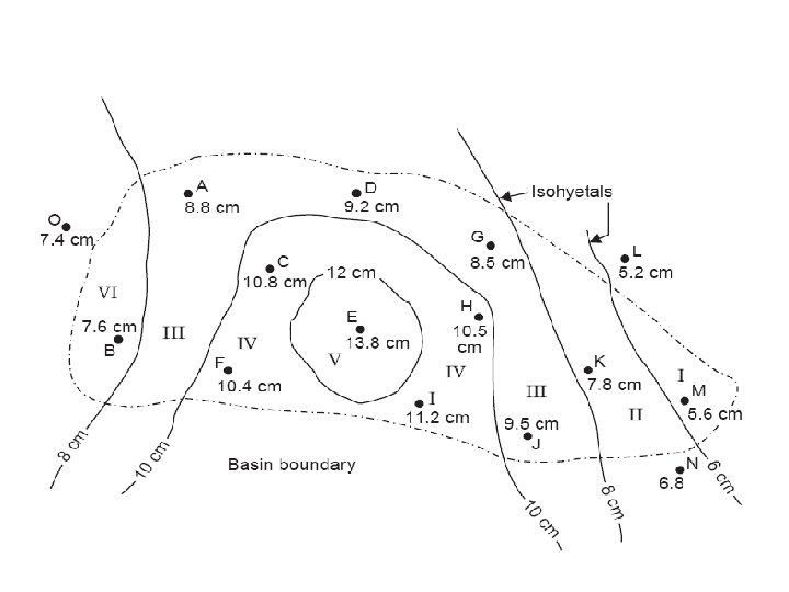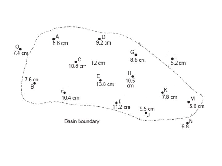 Ex 8: pound rainfalls due to a storm at several raingauge stations in a basin are shown in Figure below. Determine the mean areal depth of rainfall over the basin by the three methods.