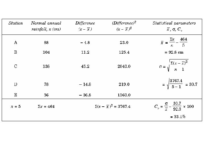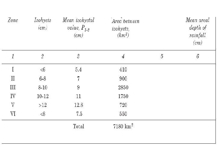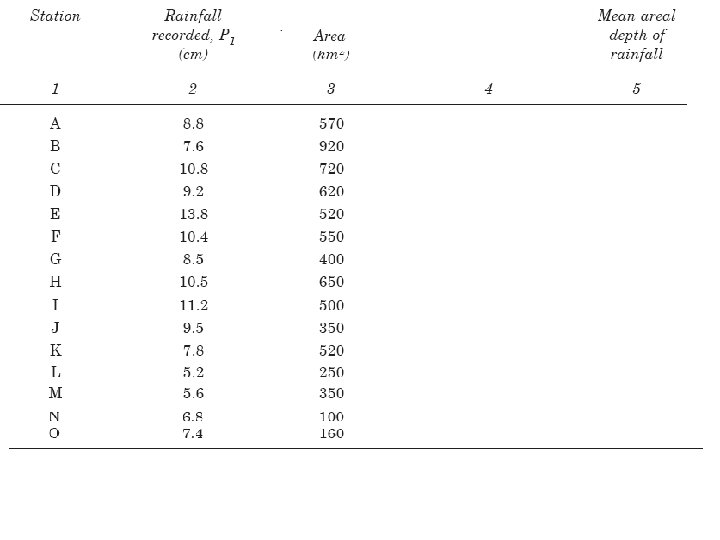 Example : Estimate the mean precipitation for the catchment area were tabulated as below: Solution :