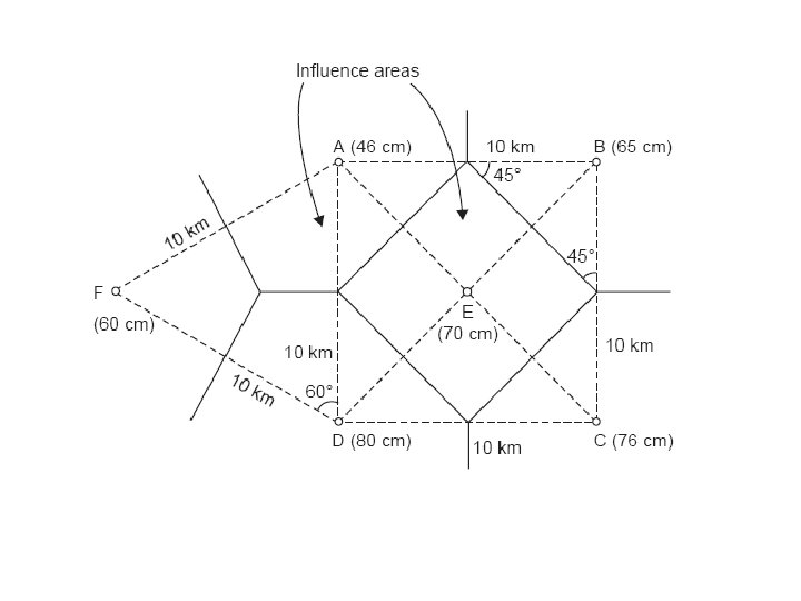 Assignment 2 1 -The area shown in Figure below is composed of a square plus an equilateral triangular plot of side 10 km. The annual precipitations at the rain-gauge stations located at the four corners and centre of the square plot and apex of the triangular plot are indicated in figure. Find the mean precipitation over the area by Thiessen polygon method, and compare with the arithmetic mean method.