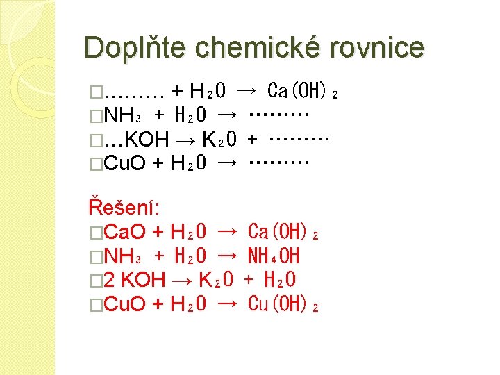 Zapište děje chemickými rovnicemi �Hydroxid sodný a draselný se velmi dobře rozpouští ve vodě a při tom se štěpí na kationty kovu a hydroxidové anionty Řešení: �Na. OH → Na⁺ + OH⁻ �KOH → K⁺ + OH⁻